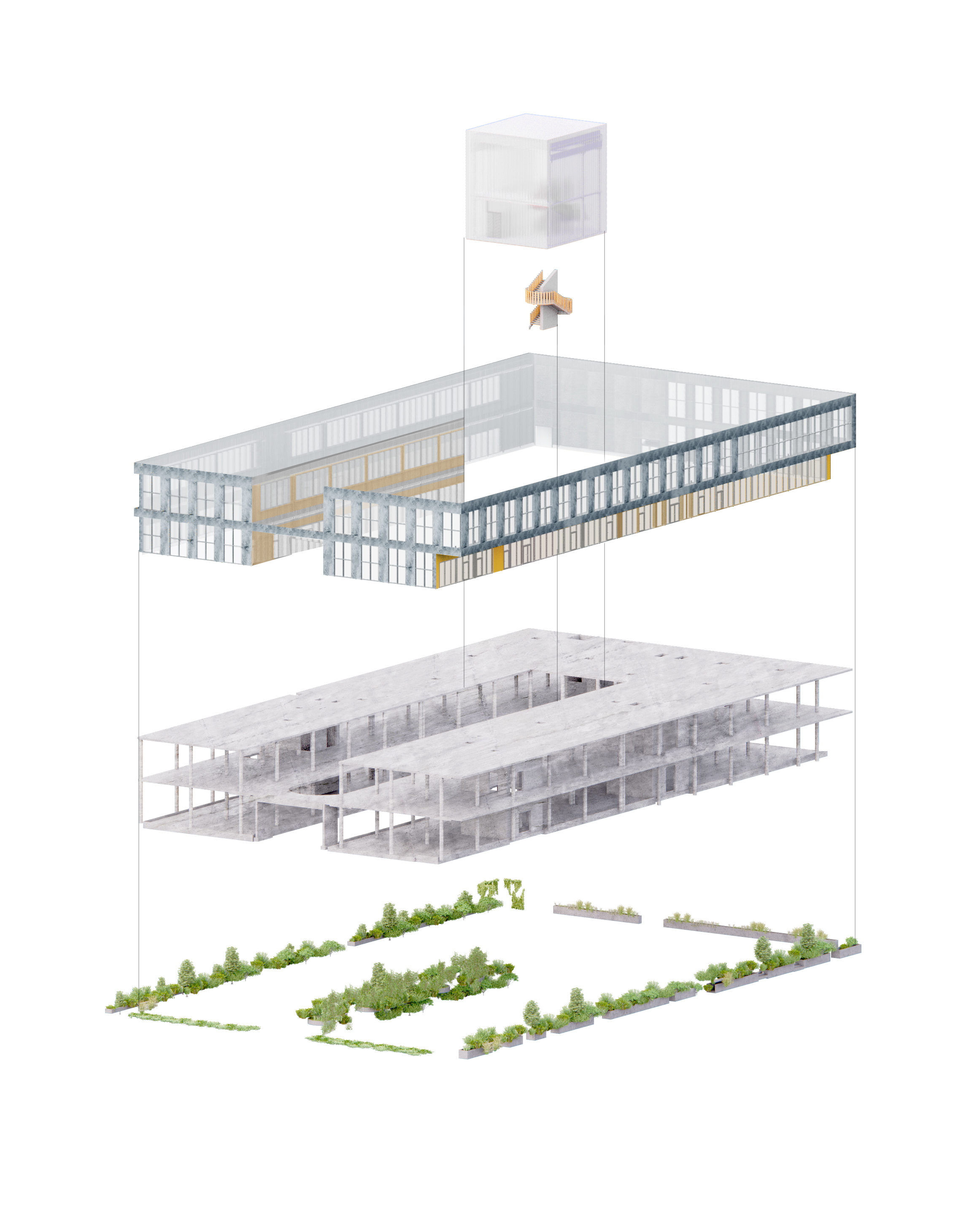 by transforming the unfinished concrete skeleton into a vibrant social and cultural hub within an otherwise monofunctional sleepy neighborhood.